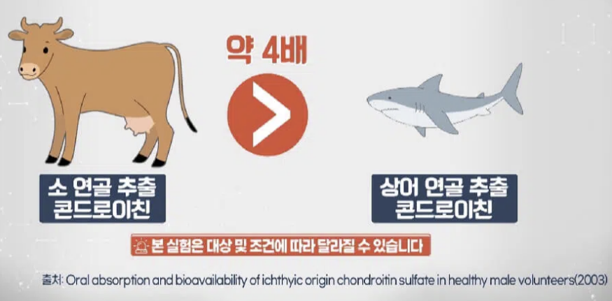 콘드로이친은 크게 소와 상어의 연골에서 추출되는 것으로 나뉩니다. 이 중 소에서 유래한 콘드로이친은 인간의 연골 내 구조 및 성분이 매우 유사하게 나타나 높은 체내 흡수율을 자랑합니다.